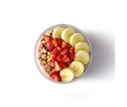 Vanilla soymilk, strawberries, bananas, nonfat Greek yogurt, organic granola, peanut butter Toppings: bananas, strawberries, organic granola (Contains milk, peanut, soy)