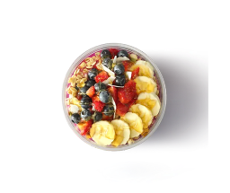 Acai grape juice blend, strawberries, blueberries, vanilla soymilk, bananas Toppings: bananas, strawberries, organic granola, blueberries, honey, coconut flakes (Contains coconut and soy)